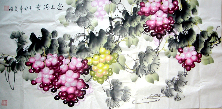第一字画网的水墨画葡萄,这幅四尺花鸟作品非常适合挂在家里的餐厅或客厅,装裱后尺寸达到1.8米长,作品细腻生动、栩栩如生,如果放在画廊出售,王美琦老师此幅水墨画葡萄的标价起码在1000元左右。